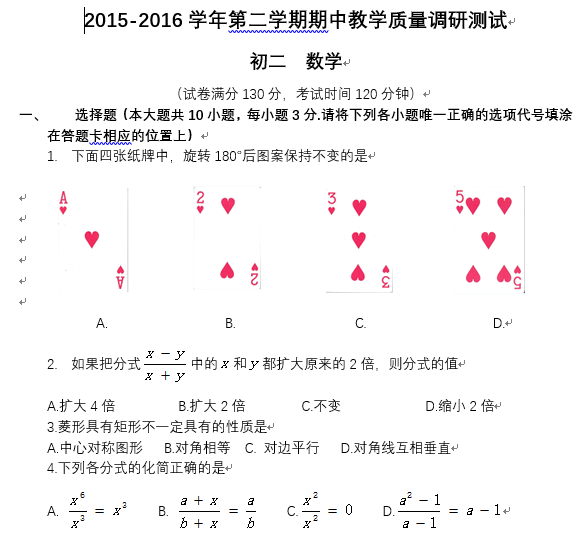 昆山市2015-2016学年第二学期初二数学期中试卷(含答案)苏科版