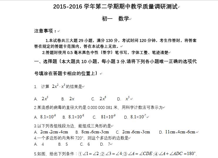 昆山市2015-2016学年初一下学期期中考试数学试卷(含答案)苏科版