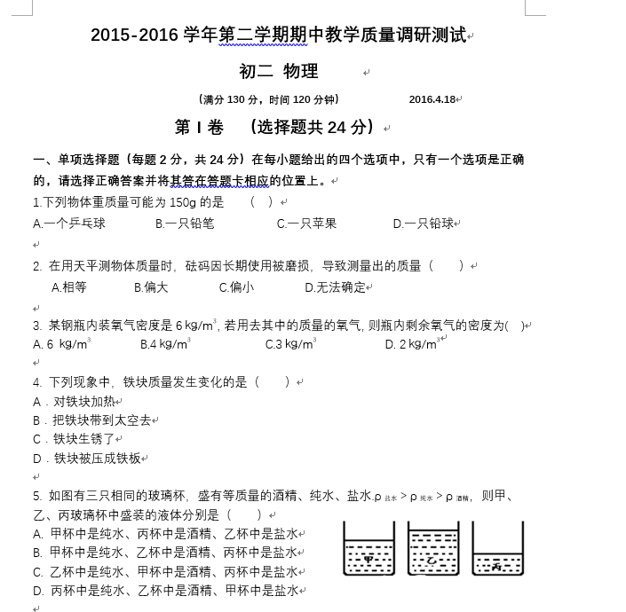 昆山市2015-2016学年初二下学期期中考试物理试卷(含答案)苏科版