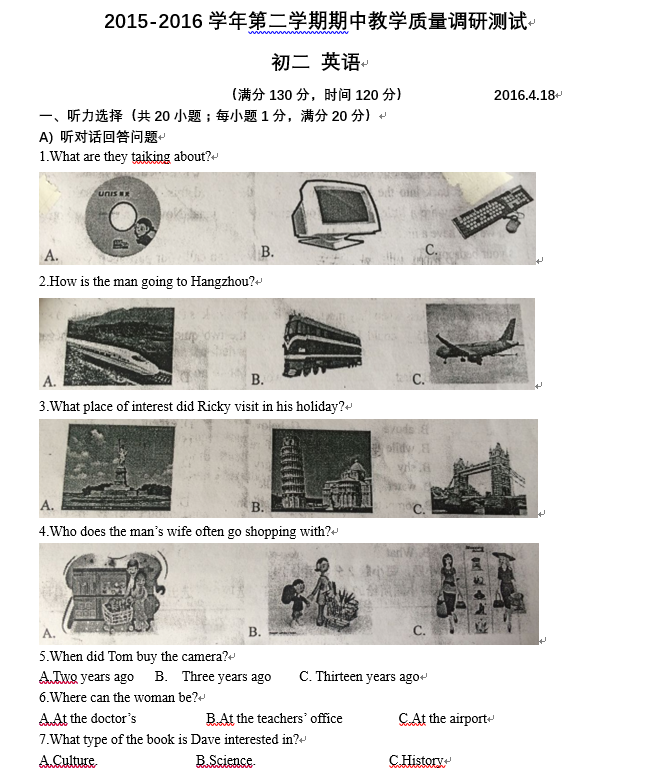 昆山市2015-2016学年初二下学期期中考试英语试卷(含答案)苏科版