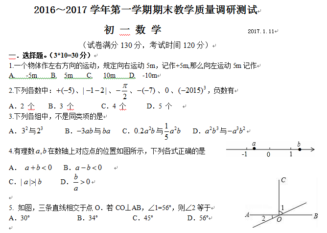 昆山市2016-2017学年第一学期初一数学试卷期末试卷及答案苏科版