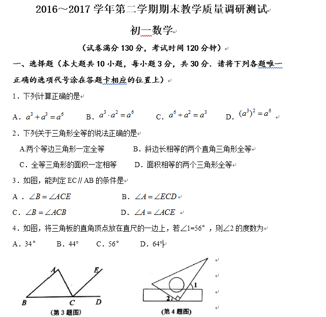 太仓市、昆山市2016-2017学年七年级下学期期末考试数学试题及答案苏科版