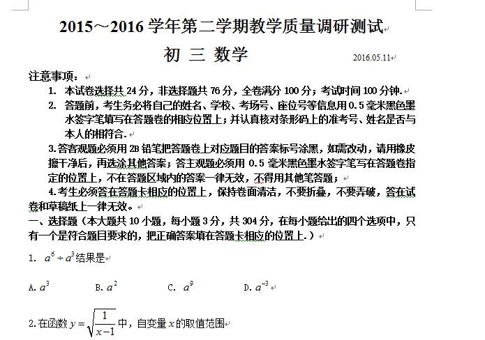 昆山市2016届中考第二次模拟数学测试卷(含答案)苏科版