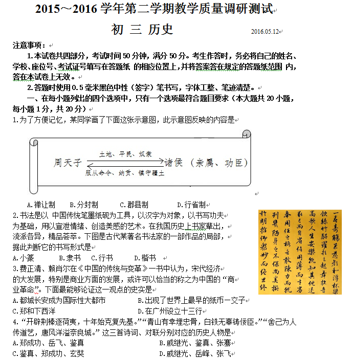 昆山市2016届中考第二次模拟历史测试卷(含答案)人教版